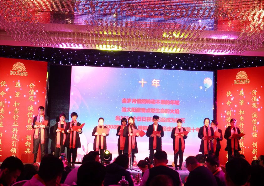 歡樂(lè)在繼續(xù),熱情在高漲!安丘博陽(yáng)機(jī)械數(shù)據(jù)中心的詩(shī)朗誦《十年精彩,共筑輝煌》,引爆了大會(huì)的高潮。詩(shī)歌分為四大部分:十年、歷程、感恩、展望!從2008年6月19日到現(xiàn)在,安丘博陽(yáng)機(jī)械已經(jīng)走過(guò)了十個(gè)年頭。十年奮斗和進(jìn)取、十年功勛和業(yè)績(jī);十年磨礪十年拼搏,鑄就了我們安丘博陽(yáng)機(jī)械鋼鐵般的品牌信譽(yù),和我們博陽(yáng)人堅(jiān)韌和抱負(fù)!回首,來(lái)時(shí)的路是泥濘的,但是只有泥濘的道路才能留下腳??;來(lái)時(shí)的路是坎坷的,但是只有遇到困難才能有下一步的成長(zhǎng)!