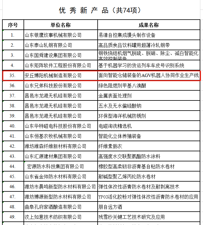 根據(jù)《山東省企業(yè)技術(shù)創(chuàng)新獎(jiǎng)審定管理辦法》和有關(guān)評審細(xì)則,由山東省企業(yè)技術(shù)創(chuàng)新促進(jìn)會和山東省中小企業(yè)發(fā)展促進(jìn)中心聯(lián)合組織的2019年度技術(shù)創(chuàng)新youxiu成果、youxiu新產(chǎn)品、youxiu論文評選活動已結(jié)束,安丘博陽機(jī)械的面向智能倉儲裝備的AGV機(jī)器人協(xié)同作業(yè)系統(tǒng)和面向智能倉儲裝備的AGV機(jī)器人協(xié)同作業(yè)生產(chǎn)線分別榮獲2019年度山東省企業(yè)技術(shù)創(chuàng)新“youxiu成果一等獎(jiǎng)”和“youxiu新產(chǎn)品一等獎(jiǎng)”?。。?br />